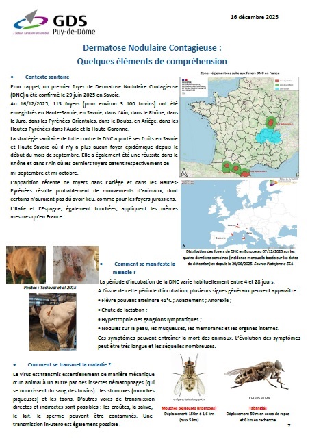 DNC : Dermatose Nodulaire Contagieuse BULLETIN D'INFORMATIONS SUR LA DERMATOSE NODULAIRE CONTAGIEUSE (DNC) Comme vous l’avez probablement vu dans les médias, la Dermatose Nodulaire Contagieuse (DNC), une maladie virale des bovins transmise par les stomoxes et les taons, a été détectée en Savoie et en Haute-Savoie fin juin. Il est donc important de rester attentif aux animaux en provenance de Savoie, Haute-Savoie, Ain et Isère, afin de détecter rapidement tout signe clinique évocateur de la maladie.